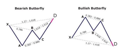 | Butterfly Pattern Présentation : Le Butterfly Pattern est un pattern d'extension (le point D excède le point X) et est souvent a l'aube d'un fort retournement. La CD s'étend de 1.27 à 1.618 de la jambe XA. D'après les stats de FxGroundworks le taux de réussite des Butterfly est de 87.4 %-89.79 %. Structure du Butterfly : ![]() Ratios alternatifs Fibonacci du Butterfly: Conditions requises : Le point B doit être un retracement de Fibonacci de la jambe XA de 0.786 obligatoirement.Le point D doit être une extension de Fibonacci de la jambe XA de 1.27 ou 1.618 (l'extension de 1.618 étant bien plus rare) et une extension de 1.618 à 2.618 de BC. Psychologie : Idéal de les retrouver dans des zones extrêmes de prix pour un retournement puissant.Le Butterfly pattern est souvent à l'aube d'un fort retournement de tendance. Il permet d'anticiper ce retournement avant la majorité des traders. Vu que ces patterns interviennent en fin de tendance il est important de regarder l'action du prix dans le PRZ, voir si il y a bien une réaction dans celui-ci avant d'anticiper un retournement trop rapidement. Conseils : Pour savoir si on va avoir un Butterfly en 1.27 ou 1.618 regarder a quel vitesse on arrive sur l'extension de 1.27. Attendre absolument que l'extension de la jambe XA a 1.27 soit touché pour trader. Dans un Butterfly en 1.618 la projection de BC est de 2.24 ou 2.618. Un ratio de fibonacci de plus longue durée doit être regroupé dans le PRZ. |